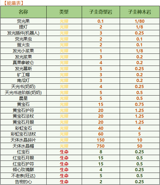 1、下列【能量表】中的物品能够给予子圭神木岩和子圭奇型岩; 2、根据给予的物品,神木岩和奇型岩的对应的能量增加; 3、神木岩的光耀与生命能量都不小于2点时,两种能量都消耗2点,然后会召唤玄鸟; 4、奇型岩每次进入下一个生长阶段,或者过量生长时,若生命能量不小于1点,掉落1子圭石(对应能量-1),若光耀能量不小于1点,再掉落1子圭石(对应能量-1); 5、玩家佩戴子圭·歃之后,可右键给子圭神木岩和子圭奇型岩传递生命,每次传递会消耗子圭·歃的生命计数器45点(不足的话会消耗佩戴者的血量,但不会致死),子圭神木岩的生命能量会增加0.15点,而子圭奇型岩的生命能量会增加1点。